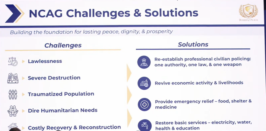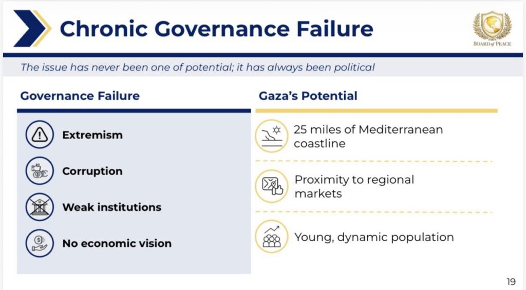 Former British Prime Minister Tony Blair, Gaza Executive Board member: For decades, Gaza’s governance has been characterized by extremism, corruption, ineffective institutions and the complete absence of a route to prosperity for the Gazan people. Yet, as President Trump recognized, its potential has always been vast: 25 miles of Mediterranean coastline, proximity to great regional and global markets, and a young, dynamic population with a median age of 19. So today we set out profound changes necessary to rebuild Gaza for Gazans — Gaza not as it was, but as it should be, including its governance, effective public institutions serving the people, a business environment where enterprise flourishes, an education system educating the young for tolerance and achievement, and a tech-enabled society making the most of the digital revolution.