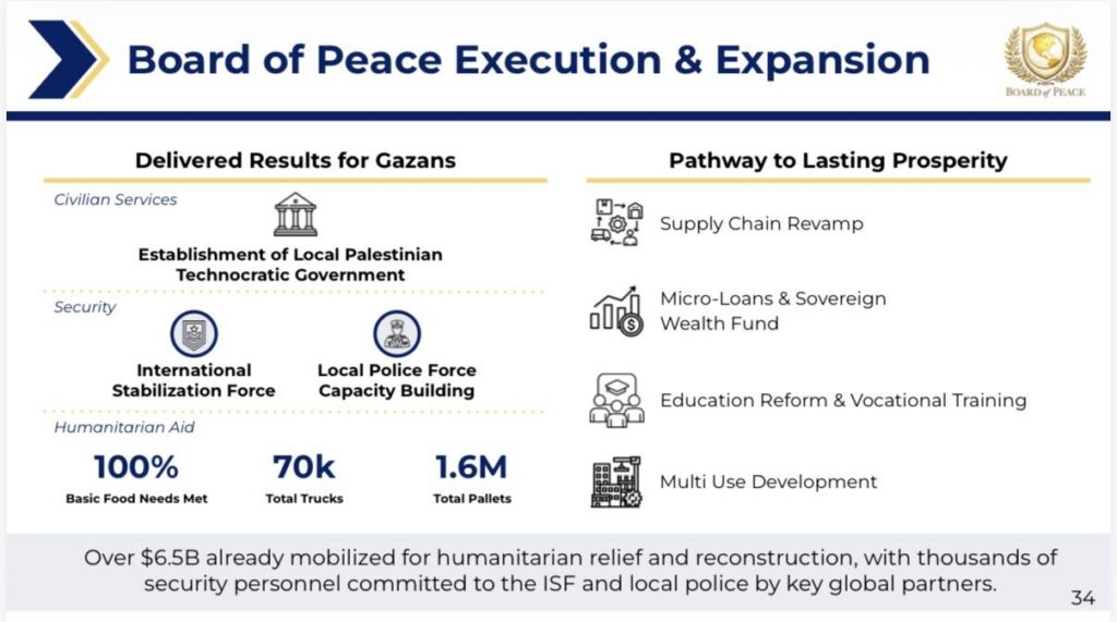 The United States and our partners have facilitated the delivery of vast amounts of humanitarian aid, numbers that nobody’s ever seen before. In November, the United Nations Security Council unanimously approved the Board of Peace, and last month in Davos we welcomed over two dozen members to this very important new organization. And we are very closely working with the United Nations. …