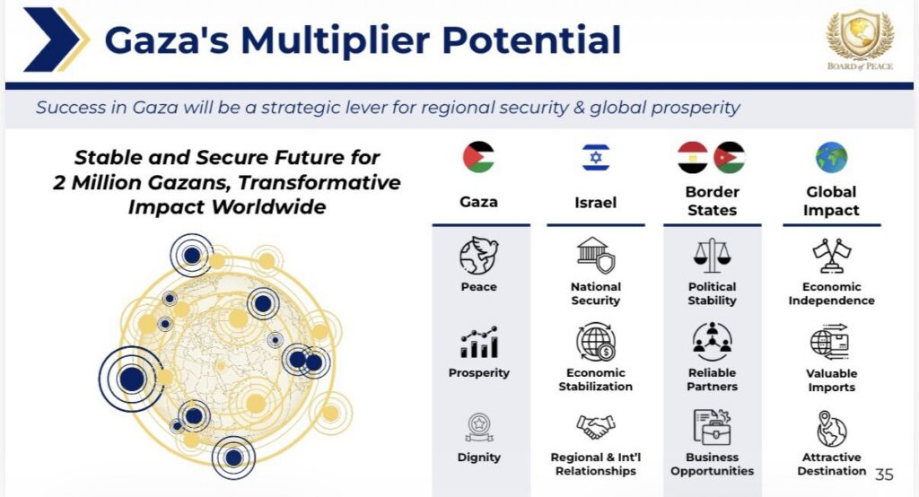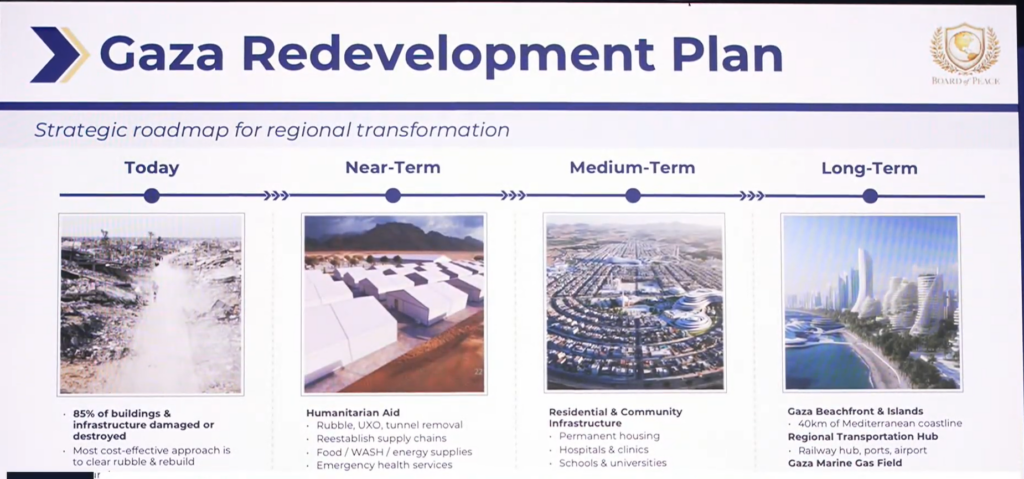 The Gaza coastline is 26 miles long. It can be developed as a new Mediterranean Riviera with 200 hotels and potential islands. The value goes to the Gazans through the Gaza Sovereign Fund. This plan is all subject to a full disarmament of Hamas. Thank you very much. Together we will make this vision into a reality. …