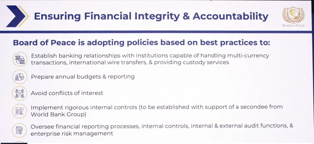 The second part of the story is that U.S. donors deserve the right to know that the money is being used in a transparent way. We are helping along with the Board of Peace, which takes the ownership of ensuring that the right kind of financial, legal and oversight mechanisms are being put in place. We’ve even assigned a financial controller from the World Bank on a secondment basis to the Board of Peace to ensure that we can try and help build the best standards in this process.