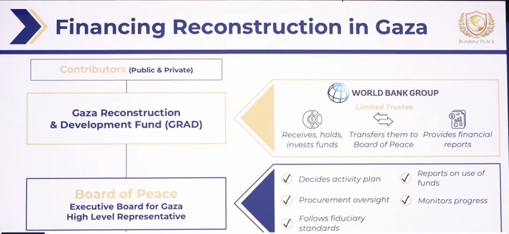 World Bank President Ajay Banga, Board of Peace Executive Board member: All this requires money, and so when the U.N. Security Council resolution got passed, we set about creating the Gaza Reconstruction and Development Fund at the World Bank. It’s housed there. The World Bank’s role is that of a limited trustee. We manage the donor contributions coming in of the type that the president said a little earlier in his opening remarks, and then we help to manage that money while it stays with us. And under the direction of the Board of Peace, we disperse the money for reconstruction and development projects in Gaza.
