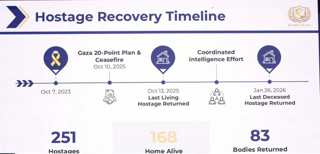 We’ve dealt with the humanitarian issue. We’ve returned the hostages, but the one final thing I just want to talk about as well from our perspective is that President Trump in his heart wanted to get the hostages home, but he also really wanted to help the people of Gaza. He saw the suffering that they were enduring not through fault of their own, because of the bad leadership that they had, the situation they were born into.