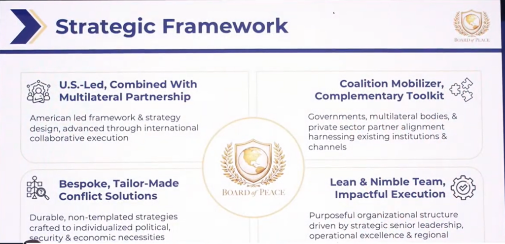 President Donald Trump: What we are doing is very simple: peace. It’s called the Board of Peace, and it’s all about an easy word to say but a hard word to produce, peace. We are going to produce it. …