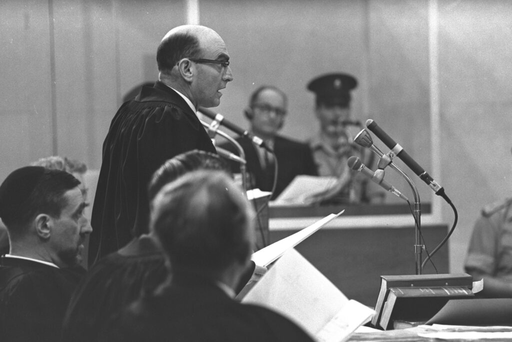 Israel’s Attorney General Gideon Hausner addresses the three presiding judges and demands the death penalty for Adolf Eichmann, an architect of the Nazi’s Final Solution.