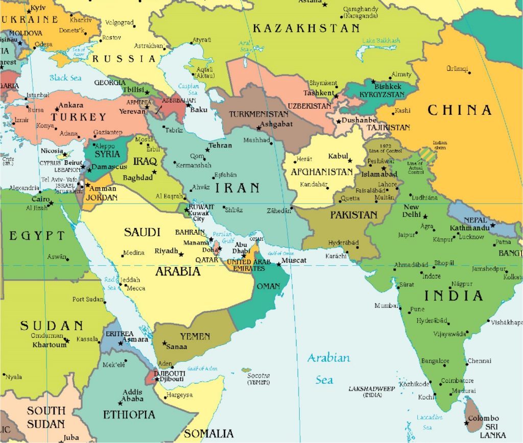 A current map showing the political borders of Israel and its nearest neighbors in the Arab world.