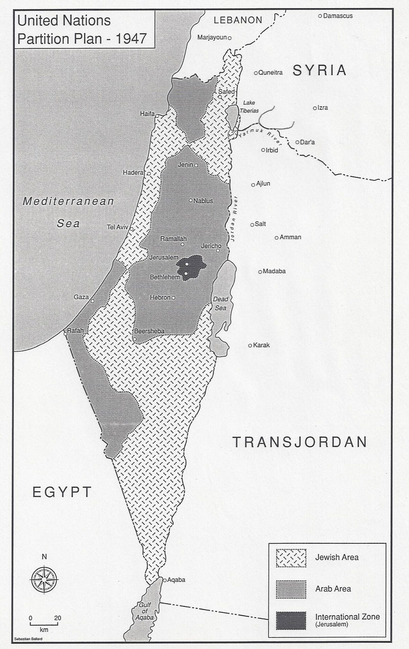 This map shows the territories controlled by Israel, Jordan (including the West Bank(, Lebanon, Syria and Egypt (including the Gaza Strip) at the end of Israel’s War of Independence in 1949. An Arab state was...