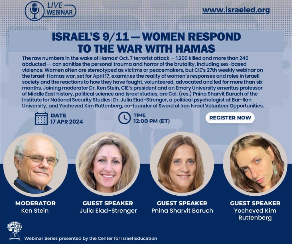 The raw numbers in the wake of Hamas’ Oct. 7 terrorist attack — 1,200 killed and more than 240 abducted — can sanitize the personal trauma and horror of the brutality, including sex-based violence. Women often are stereotyped as victims or peacemakers, but CIE’s 27th weekly webinar on the Israel-Hamas war, set for April 17, examines the reality of women’s responses and roles in Israeli society and the reactions to how they have fought, volunteered, advocated and led for more than six months. Joining moderator Dr. Ken Stein, CIE’s president and an Emory University emeritus professor of Middle East history, political science and Israel studies, are Col. (res.) Pnina Sharvit Baruch of the Institute for National Security Studies and Dr. Julia Elad-Strenger, a political psychologist at Bar-Ilan University.