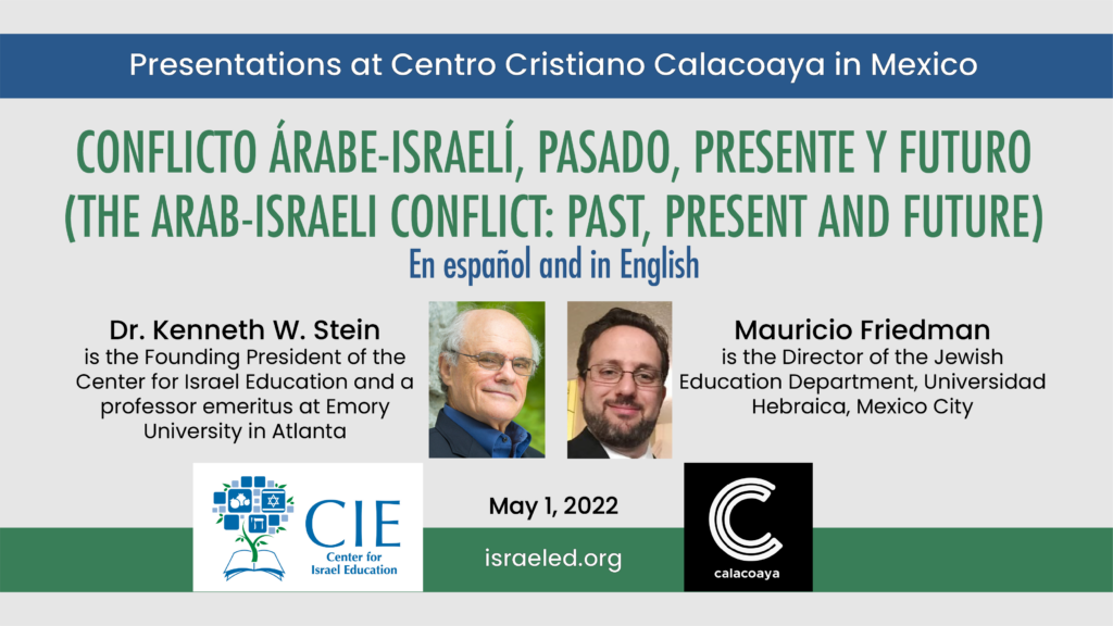 El presidente fundador de CIE, Kenneth W. Stein, con una traducción continua de Mauricio Friedman de la Universidad Hebraica, se dirige a una iglesia evangélica fuera de la Ciudad de México, los orígenes y la evolución del aspecto conflictivo palestino-israelí no se resolverá en un futuro próximo porque una mayoría de personas en ambos lados no reconocen la soberanía legítima del otro lado.