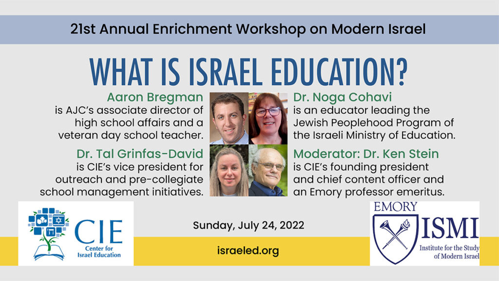 In a 30-minute video drawn from a session July 24, 2022, at the 21st annual CIE/ISMI Enrichment Workshop on Modern Israel, four veteran Israel educators define Israel education, differentiate it from Israel advocacy, discuss how educators can do it better, and preview online, multilingual learning units in development through Israel’s Ministry of Education.