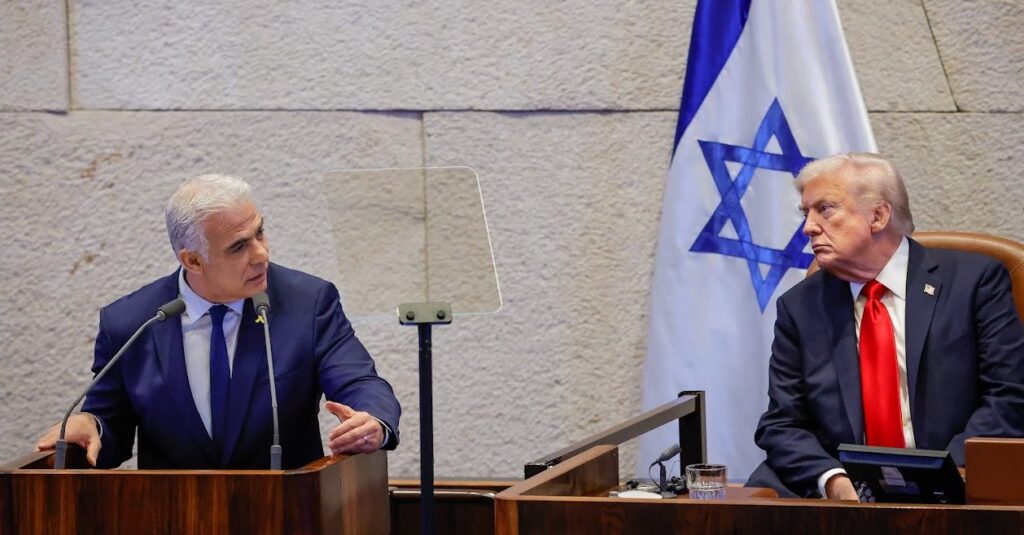 Opposition leader Yair Lapid, addressing the Knesset, praises Donald Trump for brokering the Gaza peace plan, calls on his fellow Israelis to renew their values-based democracy, and warns Israel's enemies in the Middle East and beyond that the Jewish state is here to stay.